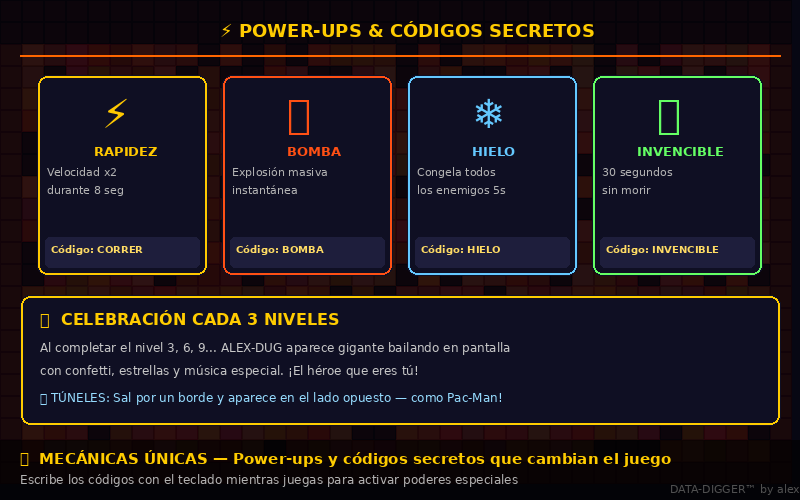 ✅ Power-ups secretos (escribe: CORRER, INVENCIBLE, BOMBA...)